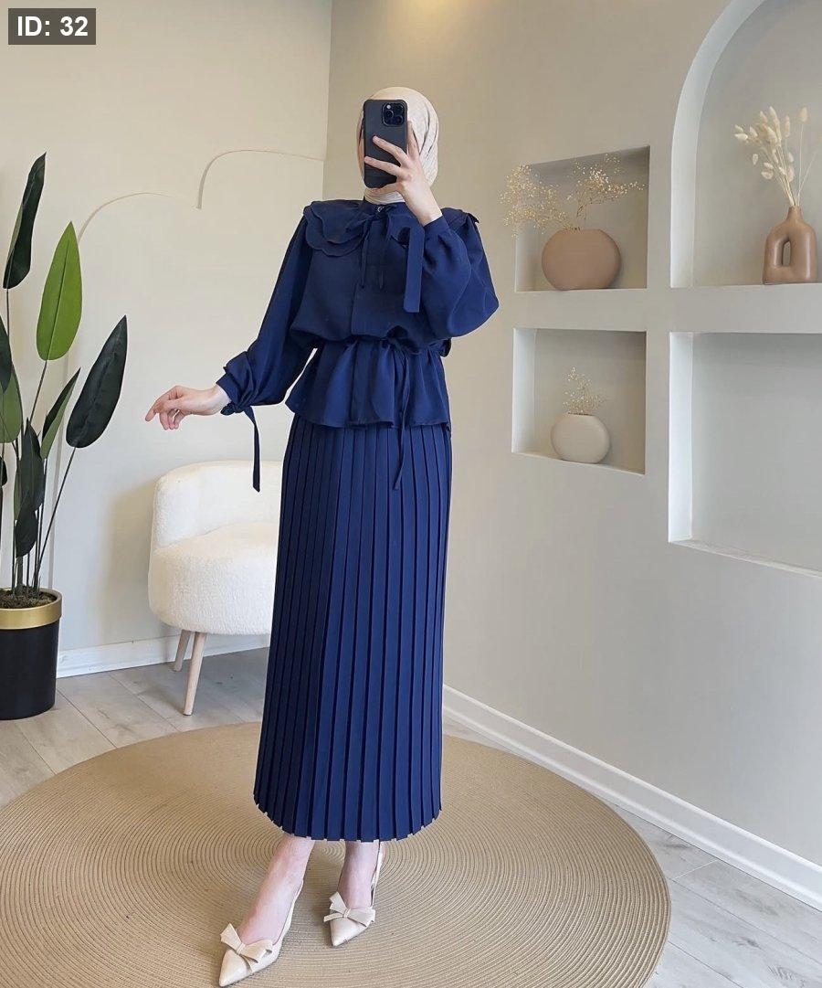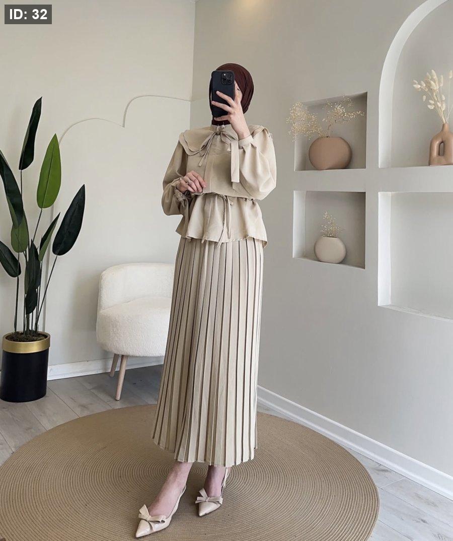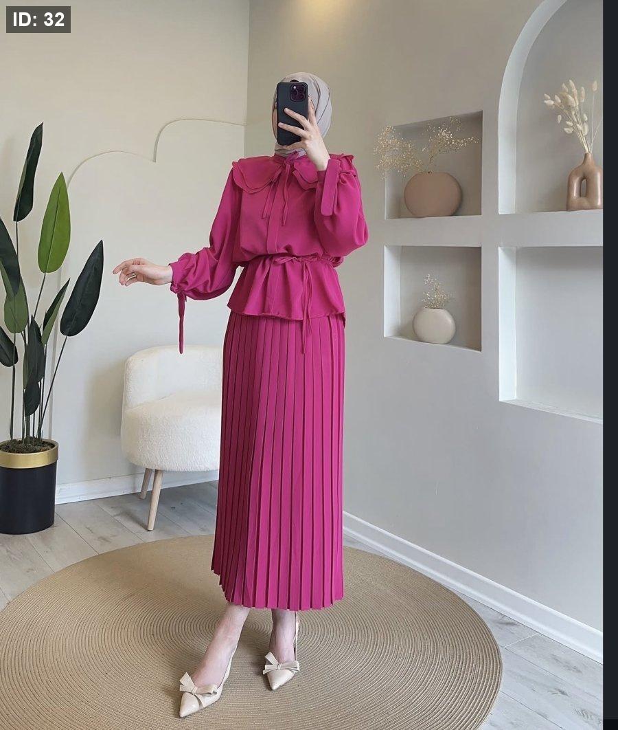 "طقم قطعتين بتصميم يجمع بين التنورة المكسرة والبلوزة ذات الياقة العريضة، لإطلالة محتشمة وراقية."