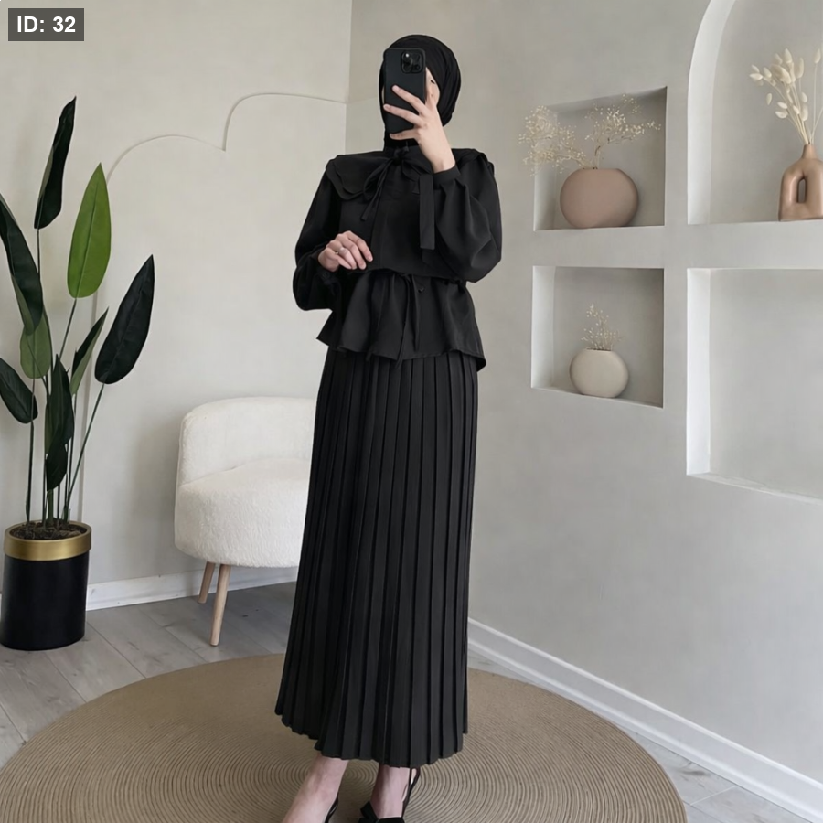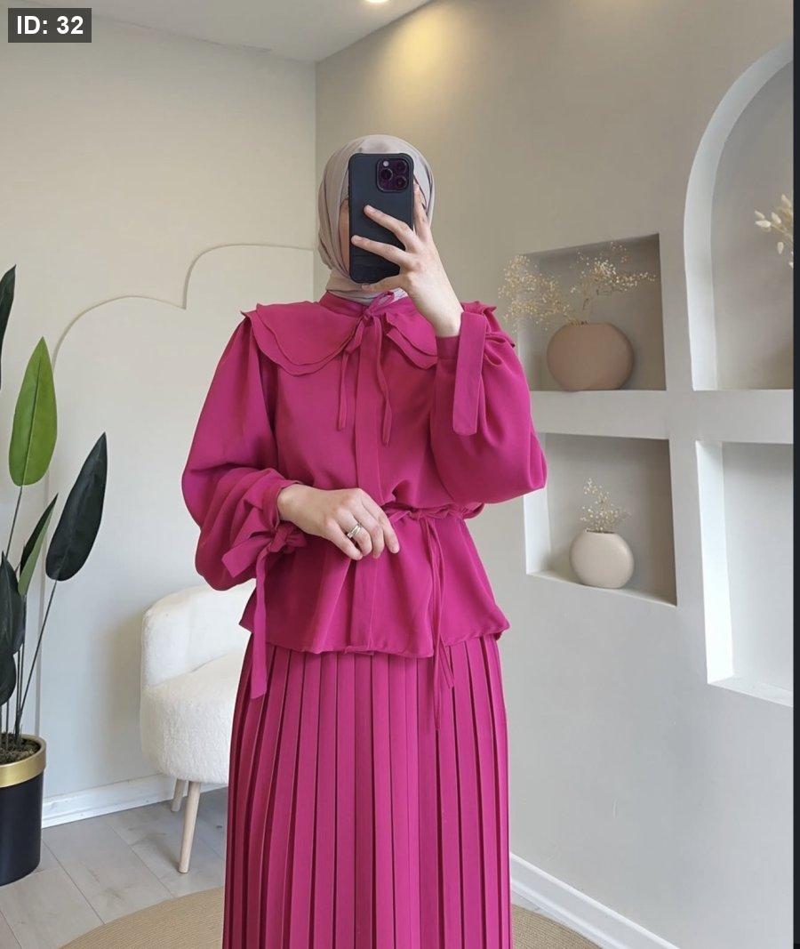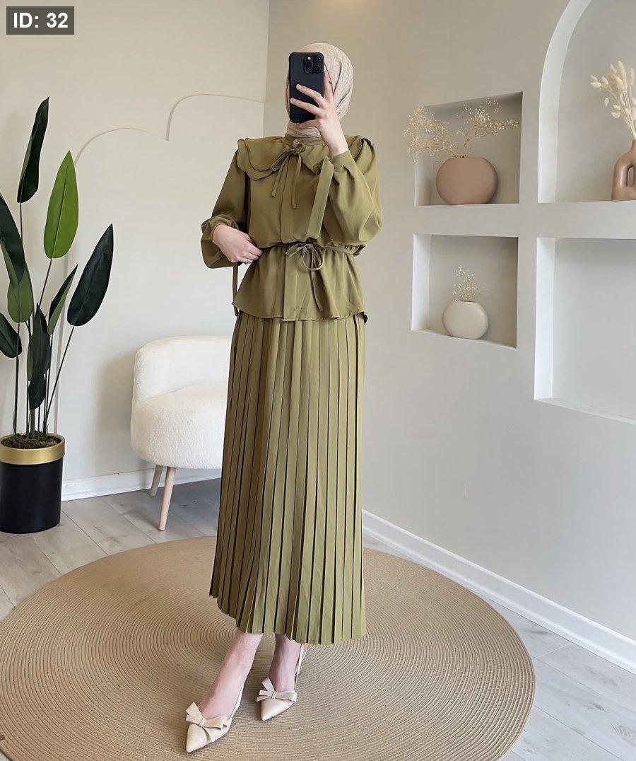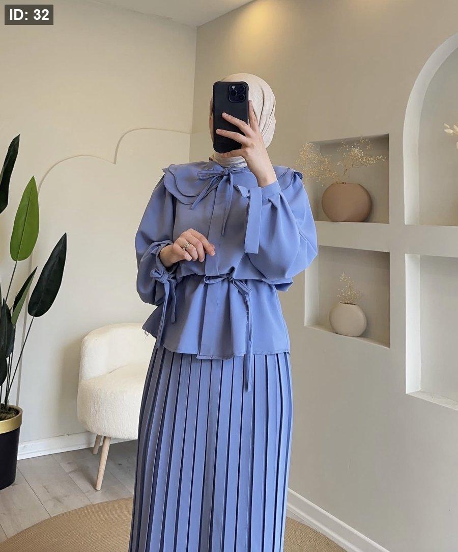 "طقم قطعتين بتصميم يجمع بين التنورة المكسرة والبلوزة ذات الياقة العريضة، لإطلالة محتشمة وراقية."